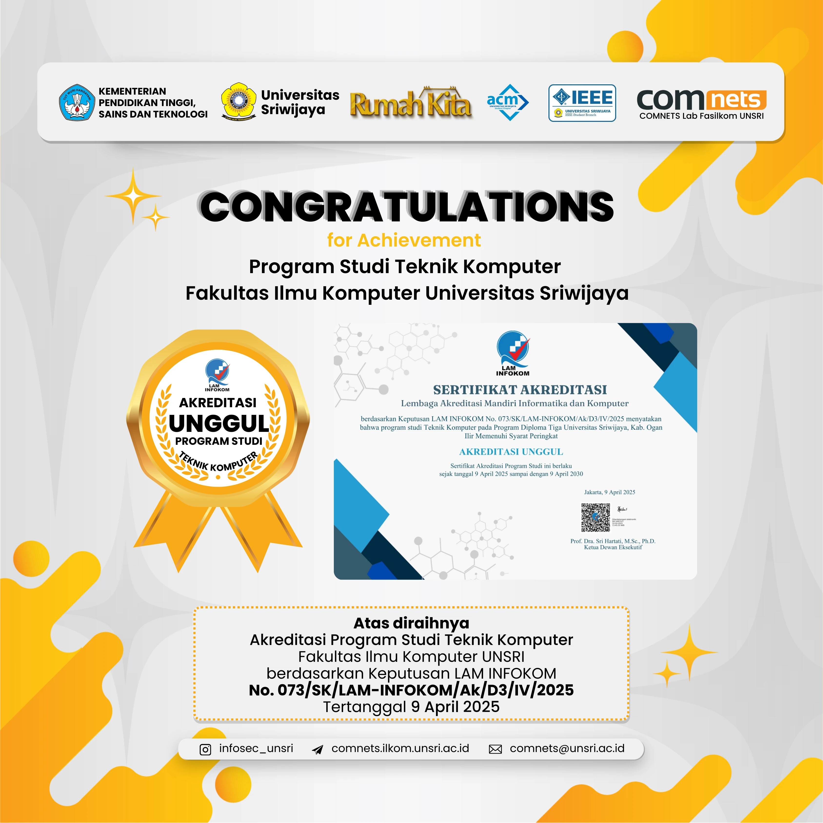 Salah satu program studi kebanggaan, yakni Program Studi Teknik Komputer, baru saja menorehkan tinta emas dalam sejarah penjaminan mutu pendidikan tinggi di Indonesia. Segenap Mahasiswa/i Kelompok Keilmuan Bidang Jaringan Komputer, Enterprise dan Keamanan Informasi Universitas Sriwijaya mengucapkan Selamat dan Sukses atas keberhasilan Prodi Teknik Komputer Fasilkom UNSRI dalam meraih predikat Akreditasi "UNGGUL".