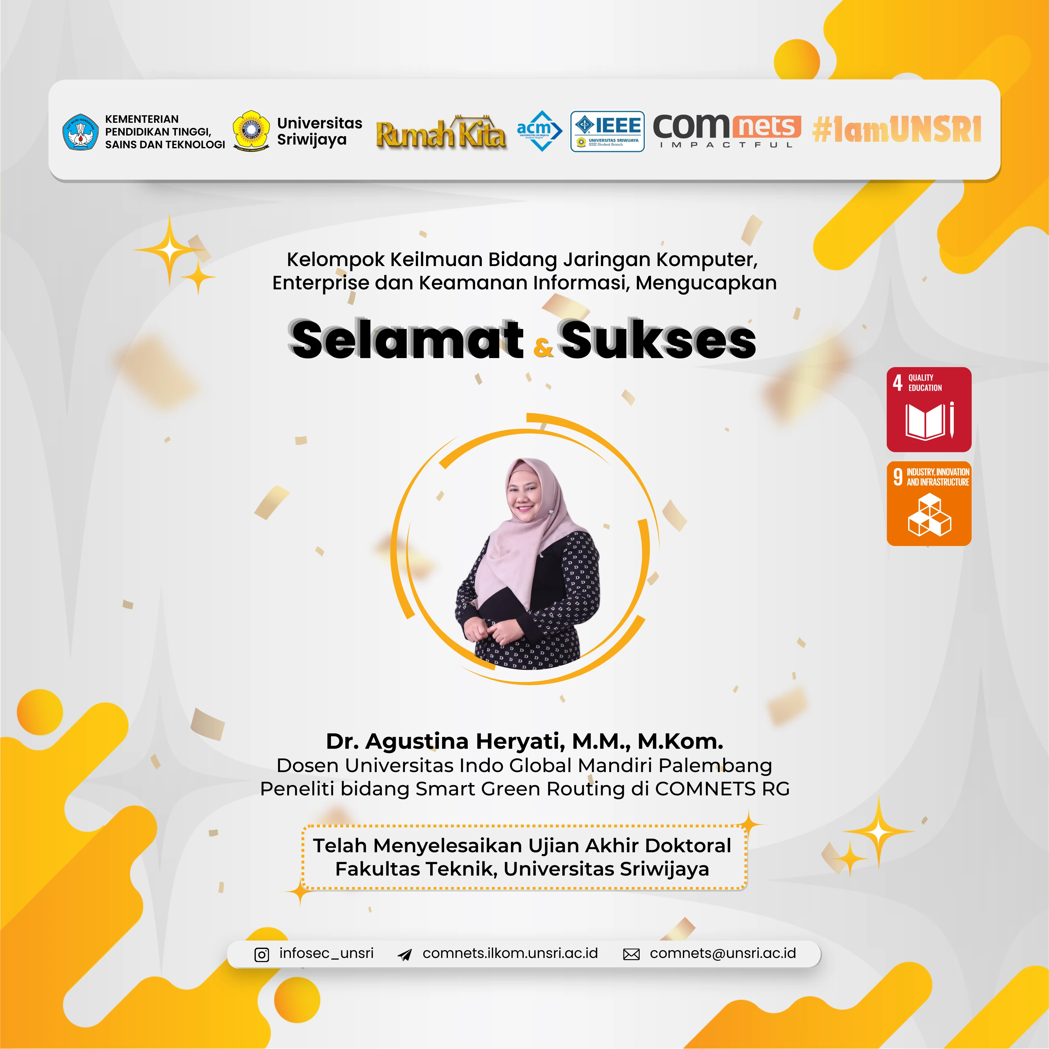 Selamat dan sukses Kepada Dr. Ery Hartati, M.Kom., yang merupakan Dosen Universitas Multi Data Palembang dan peneliti infosec COMNETS RG, kini telah menyelesaikan ujian akhir doktoral, Fakultas Teknik, Universitas Sriwijaya.