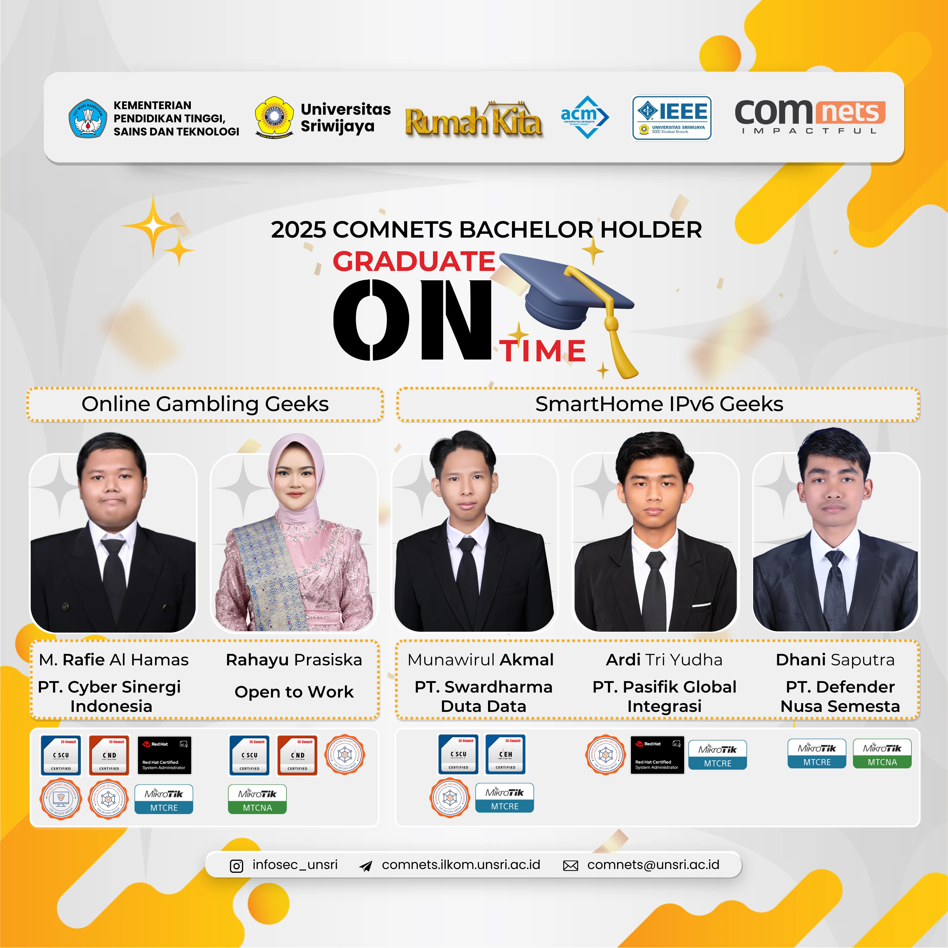 Online Gambling Geeks dan SmartHome IPv6 Geeks ini membuktikan bahwa mahasiswa COMNETS RG UNSRI memiliki daya saing tinggi. Hal ini terlihat dari deretan sertifikasi bergengsi yang mereka miliki, mulai dari sertifikasi keamanan siber tingkat lanjut dari EC-Council (C|EH, C|ND, C|SCU), sertifikasi sistem dari Red Hat, hingga kompetensi jaringan dan cloud dari MikroTik dan AWS.