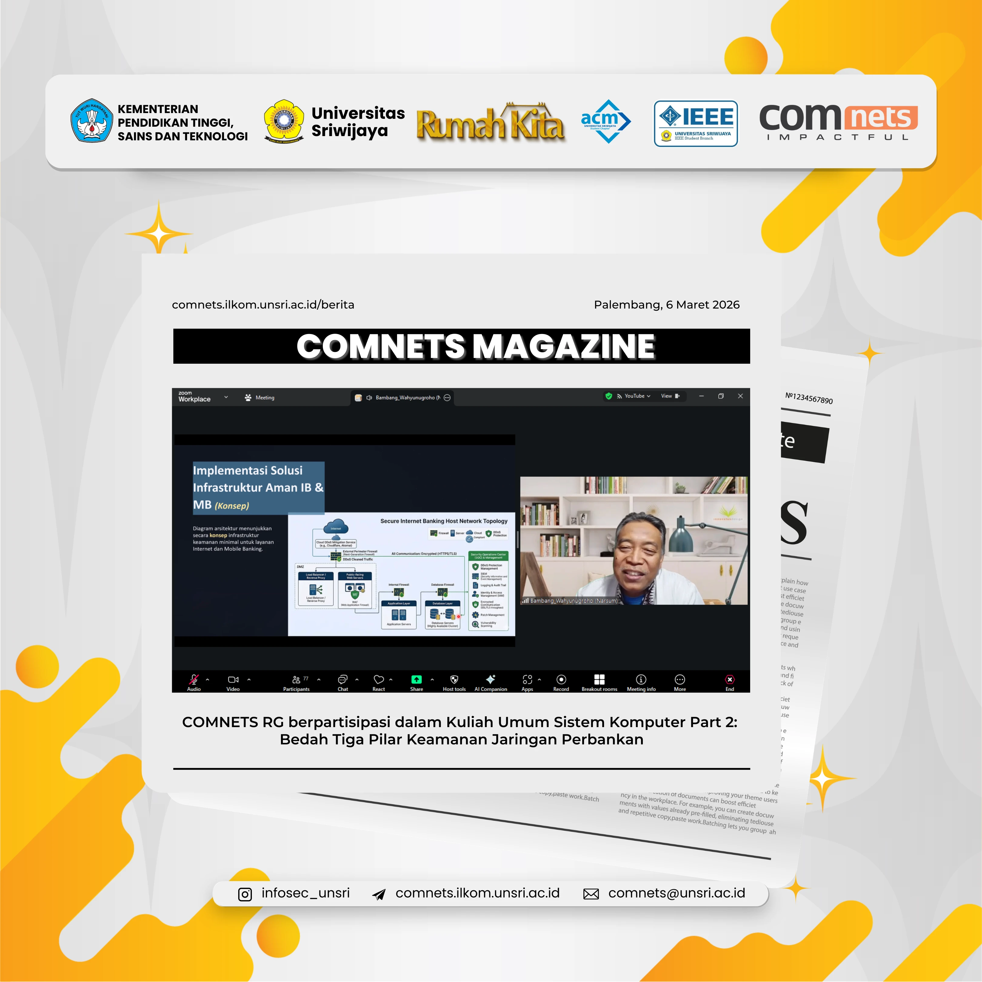 Kuliah Umum Sistem Komputer kembali menghadirkan pakar industri Bapak Bambang Wahyu Nugroho dalam sesi kedua yang menyelam jauh lebih dalam ke ranah teknis, membedah bagaimana uang nasabah dilindungi di balik lapisan-lapisan firewall dan routing kompleks.