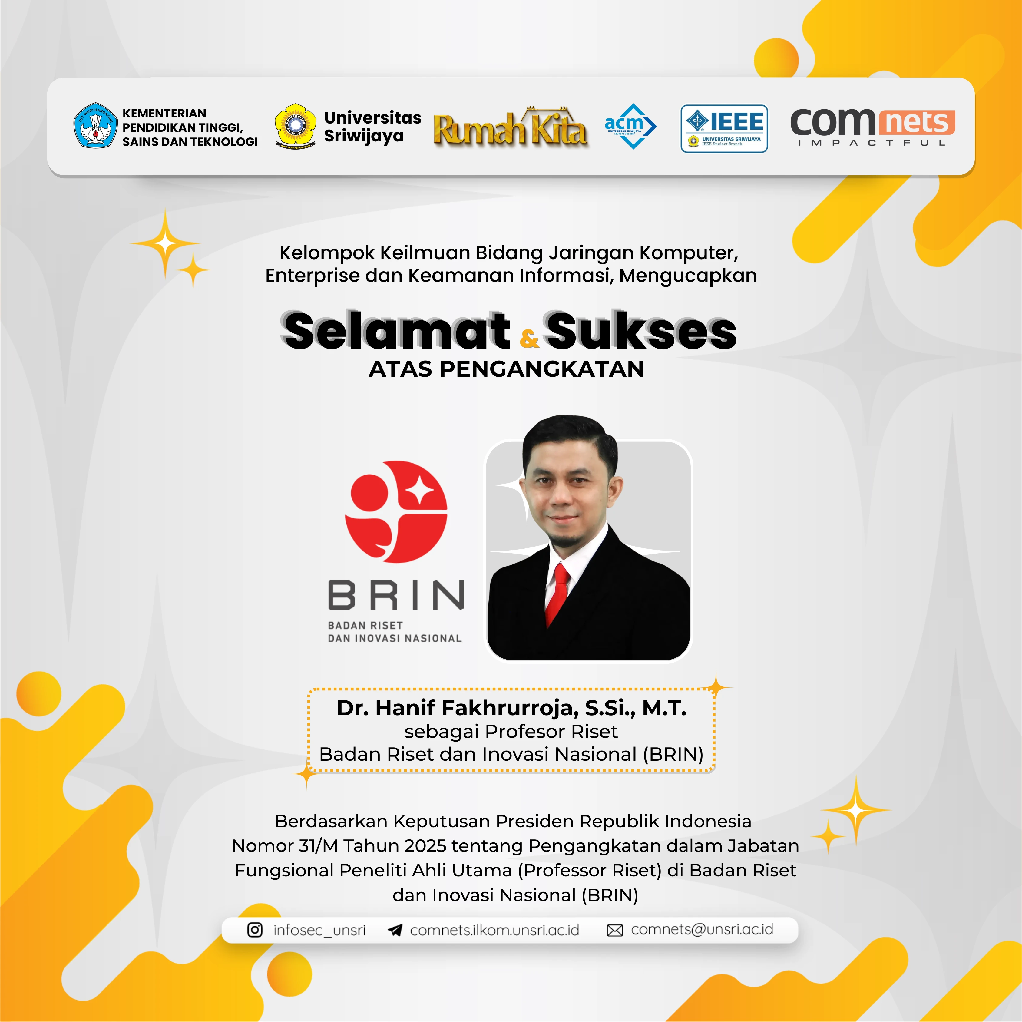 Kelompok Keilmuan Bidang Jaringan Komputer, Enterprise, dan Keamanan Informasi Universitas Sriwijaya menyampaikan ucapan selamat dan apresiasi setinggi-tingginya kepada Dr. Hanif Fakhrurroja, S.Si., M.T.